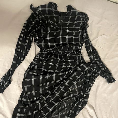siisti musta mekko, jossa vetoketju takana ja vetoketjulliset taskut sivuilla.