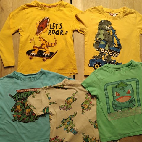 2 gollegepaitaa ( Bogi ja joku muu), 2 pitkähihaista paitaa (Peuhu ja Pdl) ja yksi Me & I pitkähihainen kauluspaita. Osassa kokomerkinnät 116 ja 104/110, mutta mielestäni vastaavat 110.