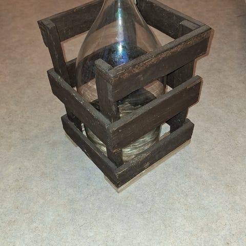 Suuri lasipullo siirrettävällä alustalla.