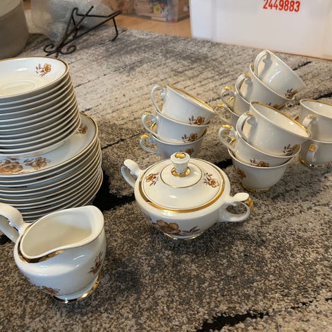 Myrna sarjan sokerikko, kermakko ja suuren leipälautasen lisäksi kahvikuppeja 8 kpl,