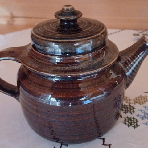 Arabia teekannu, tummanvihreä kultauksin, kultauksissa kulumaa. Korkeus ilman kantta n. 11 cm. Leiman perusteella teekannu on vanha. Nouto Lauttasaaresta.