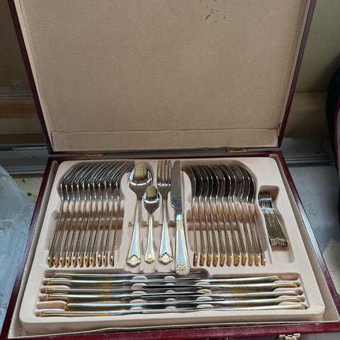 Vanhat aterimet. Materiaalista ei ole tietoa, ei ole hopeaa. Veitsen pituus 24cm ja haarukan 21cm. Hinta yht. 10€.