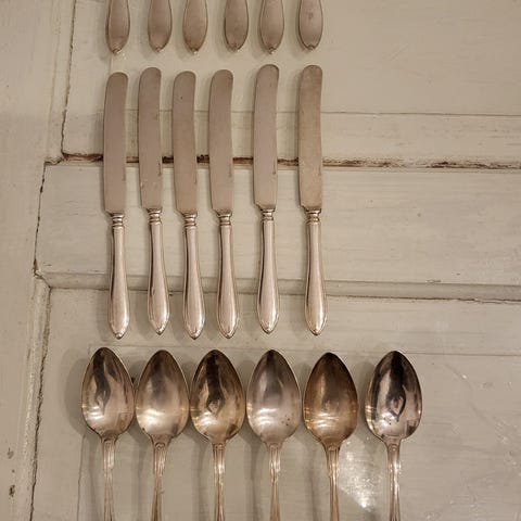 House aterimet, johon kuuluu 6kpl haarukkaa, 6kpl veistä, 6kpl isompaa lusikkaa (kaikki edellä noin 20cm) ja 6kpl pienempää lusikkaa (noin 14cm)