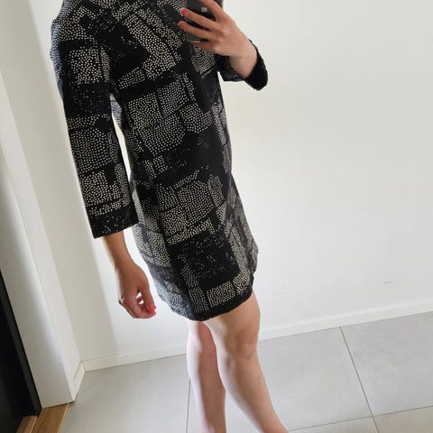 Musta, hyväkuntoinen Marimekon Amelie mekko koko 36. Mekko on jämäkkää kangasta, jossa on 52% viskoosia ja 48% puuvillaa. Kauniit hihat ja takana piilovetoketju.