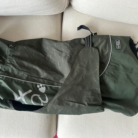 Koiran Hurtta takki, joka suojaa vedeltä ja tuulelta. Huomiovärinen. Koko 45. Tosi hyväkuntoinen.