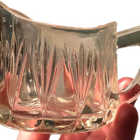 Lautasen kirkkaassa osassa himmeitä kulumisen jälkiä. Karhulan lasin Säde sarjaa on valmistettu 1930-1960 luvulla. Kermakko ja lautanen yhteishintaan 15 euroa.