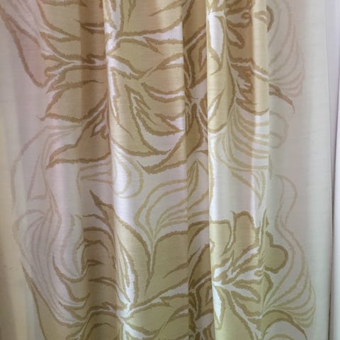 Pallokuosiset verho 1970-luvulta. Yläkapan korkeus 90-36cm, leveys 218 cm. Alakappaverho ( näitä 2kpl) korkeus 31, leveys 104 cm. Yläkapassa pieni tahra (näkyy yhdessä kuvassa) ja alakappa virttynyt nurjalta puolelta. Alakapassa verhovaijerikuja.