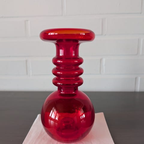 Riihimäen lasin Carmen-maljakko/kynttilänjalka. Korkeus 14 cm, ruskea.