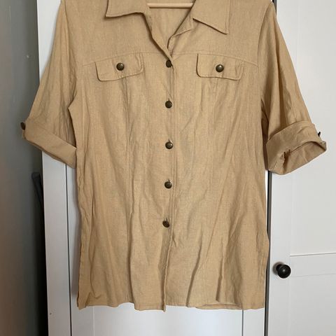 Beige/musta kuvioinen lyhythihainen kevyt pusero.Siisti, miellyttävä päällä. Vähän käytetty.