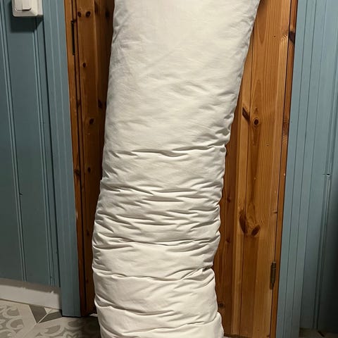 Mitat ovat noin mittoja. Muutamia kertoja käytetty. Valkoisen liinan saa pestyä päältä. Siinä hieman kellastumaa. Lisäksi mukaan saa itsetehdyn tyynynpäällisen