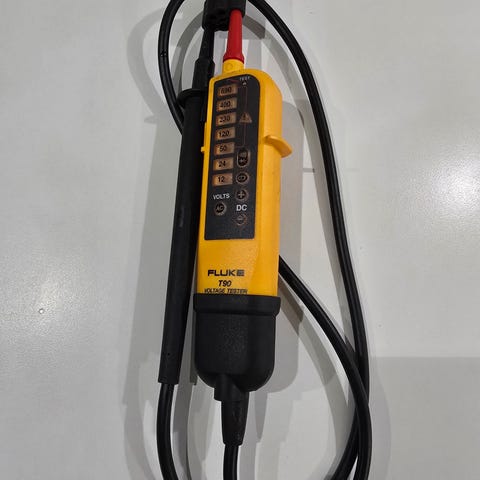 Fluke T5-1000 sähkötesteri mittausjohtimilla ja alkuperäisellä ruskealla nahkakotelolla. Testeri soveltuu sähkövirran mittaukseen ja jännitteen testaamiseen. Nahkakotelo on suunniteltu suojaamaan laitetta ja helpottamaan sen kuljetusta.