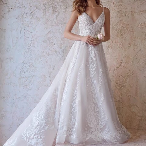 Yhdet häät juhlittu Maggie Sotteron Fairchild mielettömän kaunis häämekko. Mekkoa koristaa kauttaaltaan kaunis ja romanttinen pitsi ripauksella pientä kimalleloistoa paljetein.