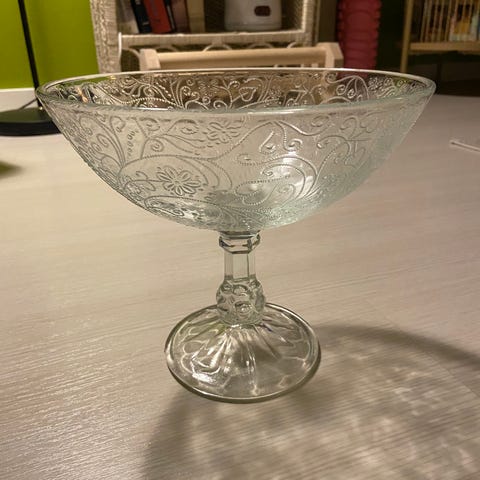 Jalallinen lasikulho. Ostanut sokokselta sen 37,-. Ollut koristeena. Kissatalous