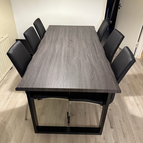 Hyväkuntoinen pohjanmaan pöytä ja 6 tuolia. Ollut kakkospöytänä, lähinnä käytetty juhlissa tai jos on enemmän vieraita. Pöydän pinta on naarmuton ja tuolit puhtaat.