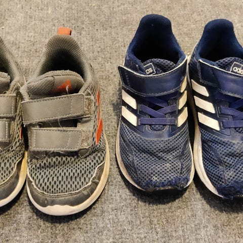 Käytetyt mutta ehjät. Tarrat pitävät hyvin. Toisessa parissa kulumaa kengän suulla.