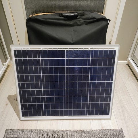 Mökiltä suoraan käytöstä purettu aurinkosähköjärjestelmä 12 V, joka sisältää: