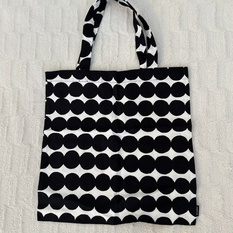 Käyttämätön Marimekon mustavalkoinen kangaskassi.