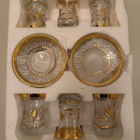 4kpl laseja, 4kpl pikku lautasia ja 4kpl lusikoita. Yhteishinta 5e.