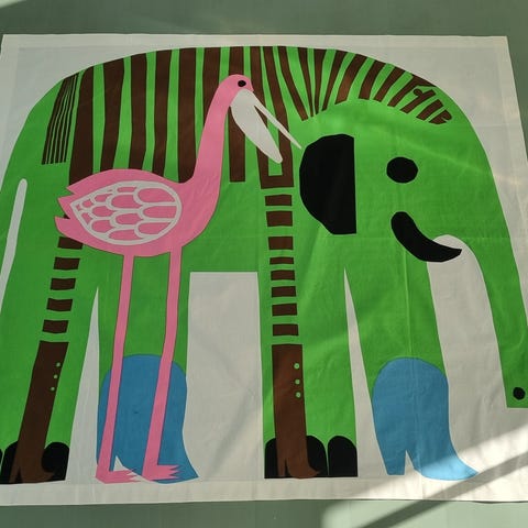 Marimekko Karkuteillä kangaskoko 140x129 cm. Värit oranssi, musta, valkoinen ja vaaleansininen. Materiaali pehmeä kangas, sopii sisustukseen ja lämmikkeeksi.Maija Louekari 2008