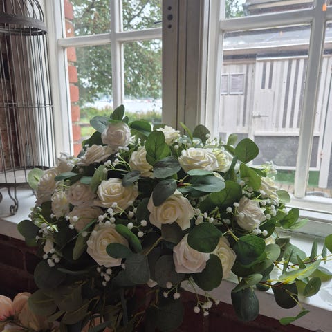 Kukka-asetelmat ovat olleet meillä hääkaaressa, mutta sopivat muuhunkin koristeluun/pöytäkoristeeksi. Pisimmän asetelman pituus noin 90 cm ja kaksi muuta 40-50 cm. Kaikki asetelmat kerralla, 45 euroa.