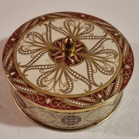 Kaunis vanha peltirasia. Arkun muotoinen missä jalat ja päällä ruusu kuviointi. Koko 10 cm × 16 cm. Nouto, postitus tai toridiili.