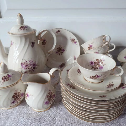Myyntiin erittäin hyvä kuntoiset Arabian astiat. Sisältää kahvikannun, sokerikko/kermakko, kastikekaadin, tarjoilu lautanen, 7 kahvikuppia/alulautasta, 6 kpl leipälautanen. Mieluiten myyn kaikki yhdessä