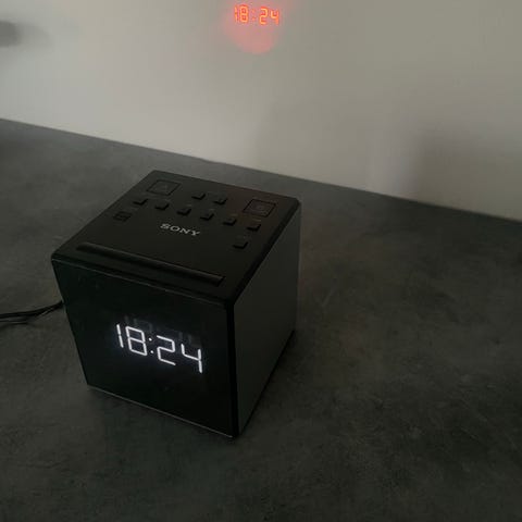 Sony herätyskello/radio, valkoinen väri. Kompakti ja neliön muotoinen laite, jossa digitaalinen kello ja herätysominaisuus. Sopii makuuhuoneen pöydälle tai yöpöydälle. Virtalähde verkkovirralla tai patterilla.