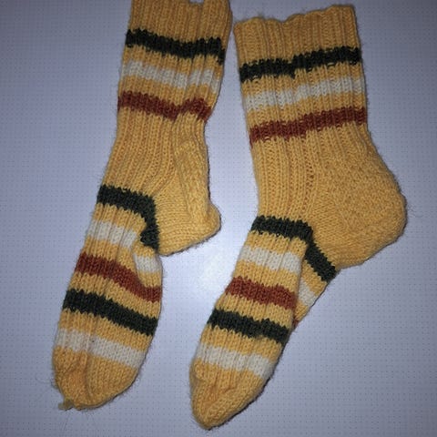 Kahdet lasten käytetyt villasukat, molemmat noin kokoa 34.