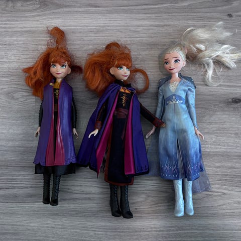 Lumikin mekon hihat ovat rispaantuneet ja Annan viitassa on hieman jälkiä. Muuten leluissa ei ole isompia käytönjälkiä.