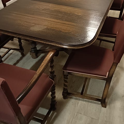 Myynnissä tummaa puuta oleva kierrebarokki pöytäryhmä 6:lla tuolilla.