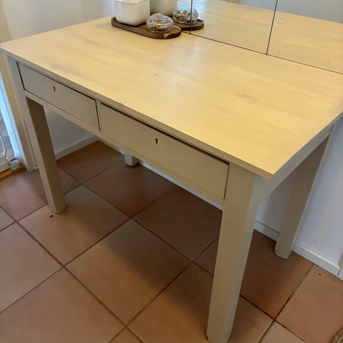 Pöytä jossa nouseva peilikansi johon saa jotakin :) . 130 leveä. 55 syvä. Korkeus 72.5 . Noin mitat. Jotain jälkeä saattaa löytyä.