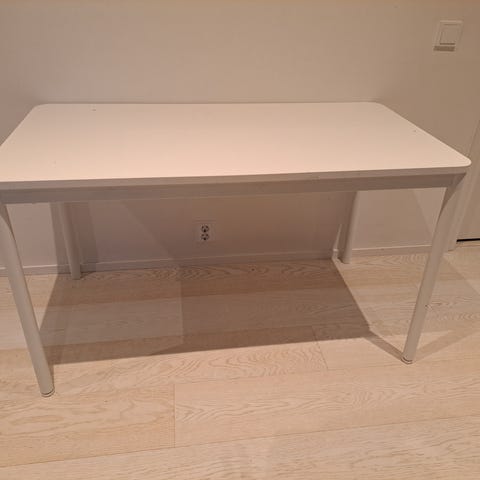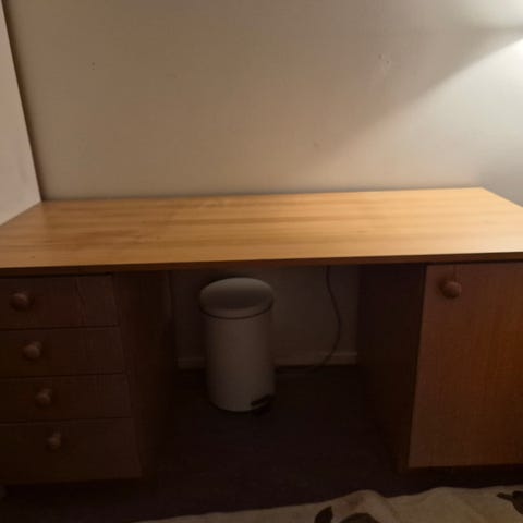 Työpöytä, jossa valkoinen työskentelytaso ja puunväriset reunat. Pöydässä on hyllytila ja laatikosto, joka sisältää kaksi vetolaatikkoa. Etureunassa ja yhdessä takakulmassa pieni lohkeama. Näistä kuvat mukana. Alemmassa pöydässä tarran jälki, joka varmasti puhdistettavissa. Sopii kotitoimistokäyttöön tai opiskeluun.