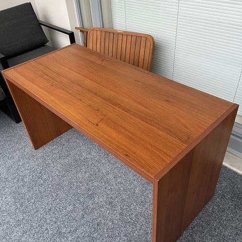 Työpöytä valkoisella ja puunvärisellä pinnalla