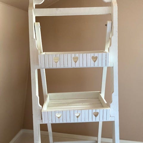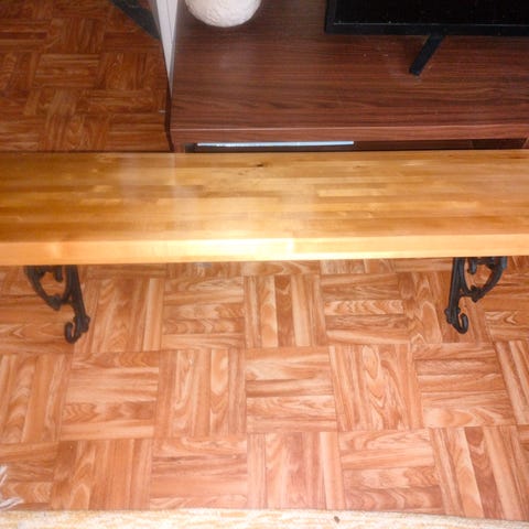 Lähes uudenveroinen, Ikean vanhempaa mallia, järeä petsattu puuhylly mustilla metallikannakkeilla.