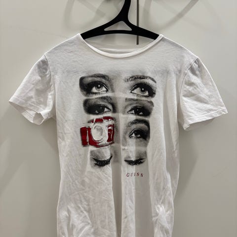 GUESS Love Me or Hate Me T-paita, musta väri, naisten koko M. T-paita on valmistettu laadukkaasta kankaasta ja siinä on kirjailtu teksti sekä koristeellinen sydänkuvio etupuolella.
