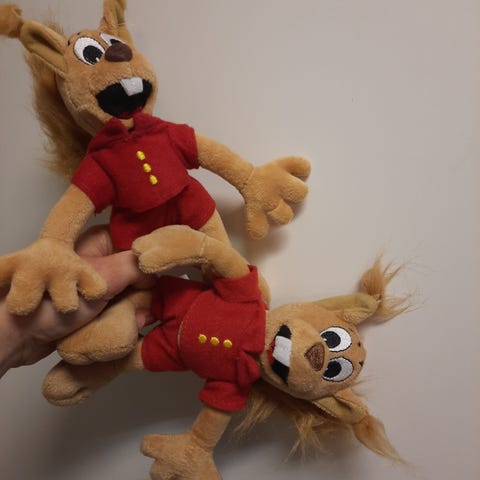 Orava pehmolelut joista isompi noin 50 cm korkea ja pienempi noin 22 cm. Iso on avaamattomassa oussissa ja pieni vain poistettu pussista näytille.