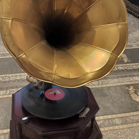 Gramofoni ja 8 kpl savikiekkoa. Yksi kpl on uudempaa tekoa, kaikki 78 rpm. Kampi puuttuu, mutta levylautasen jousi toimii, kokeiltu väliaikaisella "veivillä" Valmistusvuodesta ei tietoa.
