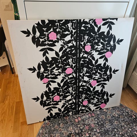 Kangastaulu, joka verhoiltu Marimekon lumimarja kankaalla. Koko n. 120 x 120 cm. Kehys puinen. Vain nouto.