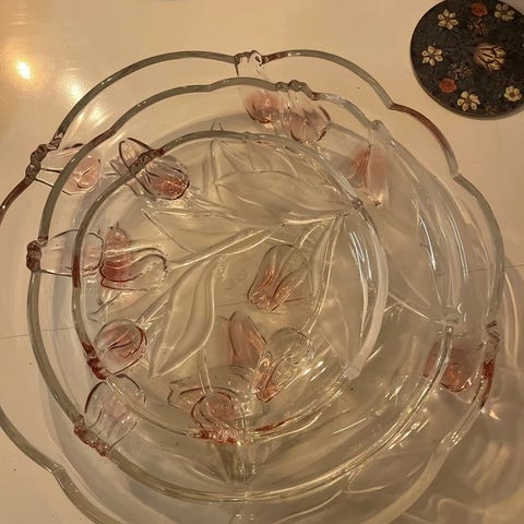 Saksalaisen lasitehtaan Walther Glassin kaunis tarjoiluastia. Halkaisija 27cm. Kuvan servietti renkaineen osoittamassa mittasuhdetta; ei sisälly hintaan.