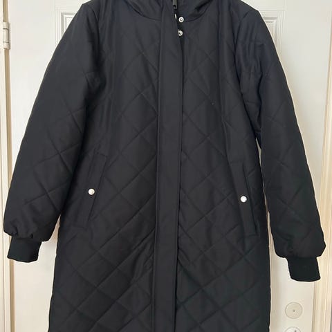 Lämmin vero moda talvitakki koko L. Musta. Pidempi malli. Huppu löytyy myös, takin sisällä.