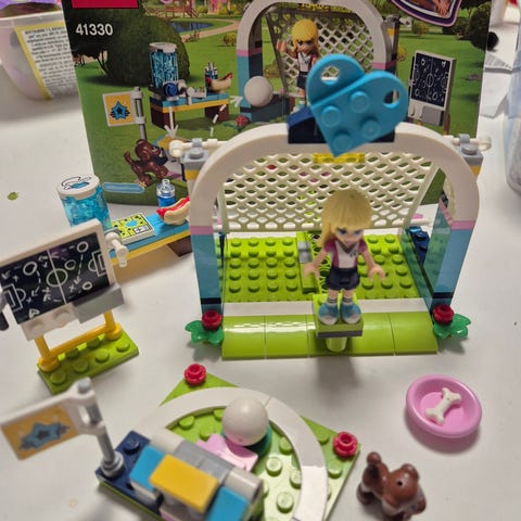 LEGO Friends 41330 Stephanien jalkapallotreenit leikkisetti sisältää minihahmon, jalkapallomaalin, pallon (alkuperäinen puuttuu, korvattu puuhelmellä) ja muita pienoisosia kuten koiran ja ruokatarvikkeita.