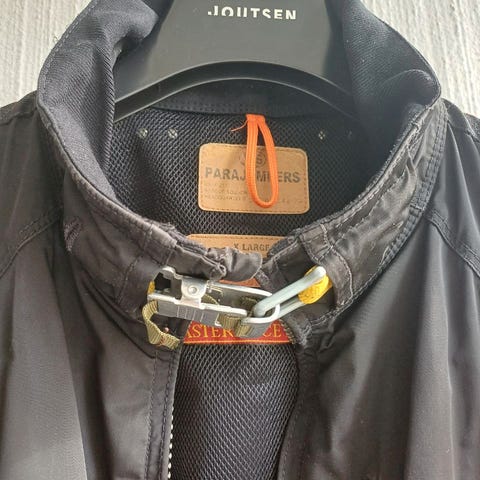 Sininen Parajumpers hybriditakki, slim XL. Kunnossa, hihat pesuissa miehekkäästi patinoituneet. Löytyy Helsingin Kampista, postitse myös muualle.