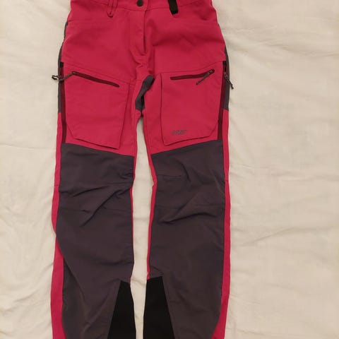 Hyväkuntoiset ulkoiluhousut. Nappi ja vetoketjukiinnitys. Vetoketjutaskut. Lahkeissa vetoketju ja säädettävä kiristys. Toisen vetoketjun vedin mennyt poikki, ei vaikuta käyttöön.