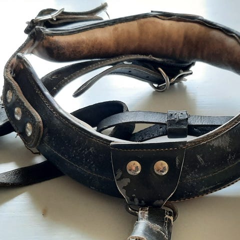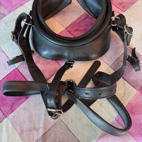 Länkivaljaat / vetovaljaat keskikokoiselle koiralle. Punaruskeaa ja valkoista nahkaa. Käytetyt, mutta hyväkuntoiset. Länkiosan korkeus minimisäädössä 17 cm ja leveys 14 cm. Rinnanympärys maksimi 90 cm.