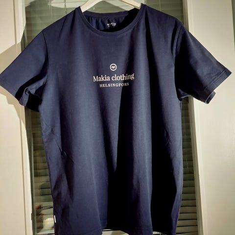 Makian miesten malliston paita, koko S, mielummin niukka kuin väljä, 100% puuvillaa. Luonnonvalkoinen ja vaaleansiniset raidat. Hyvä käytetty kunto.