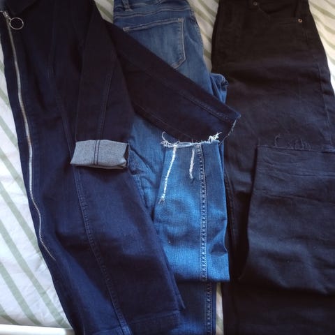 Neljät farkut,farkku caprit,neuletakki,2paitaa ja collari(uusi)mieluummin nouto mutta voin postittaa normi pakettina