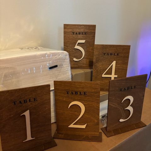 Kauniit minimalistiset pöytänumerot ihanalla puu jalustalla. Alusta on musta