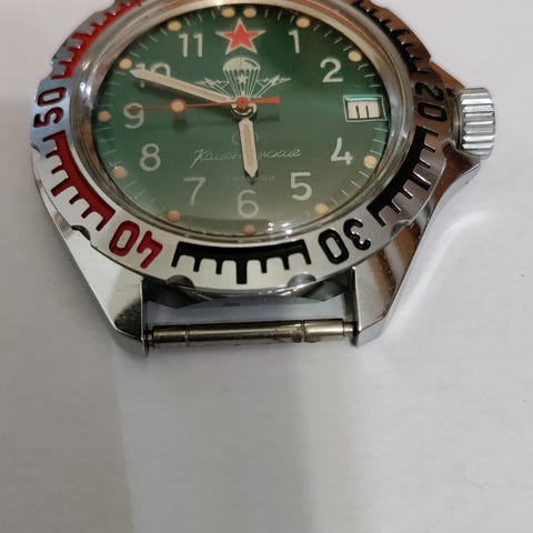 Vostok merkkinen rannekello, vuosimallia 1992 (jos oikein tulkitsin papereita). Tarkemmin Vostok Komandirskie 2414A (Officer Military Watch). Ei ole ollut käytössä. Alkuperäiset paperit ja rasia. Alkuperäinen ranneke. Rannekello toimii. Kellon halkaisija 40 mm.