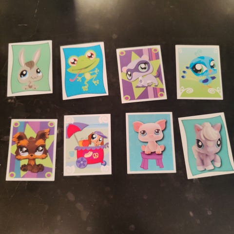 Littlest Pet Shop keräilykortit, keräilytarrat, joissa on viisi erilaista eläinhahmoa. Kortit ovat värikkäitä ja valmistettu paperista. Sopivat lasten leikkeihin ja keräilyyn. Haku Porista tai postitus ostajalle. Yhteensä 1e