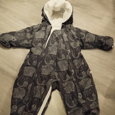Lähes käyttämättä jäänyt talvihaalari, joka lahkeiden vetoketjujen myötä muunnettavissa unipussiksi. Kokomerkintä 68/74.